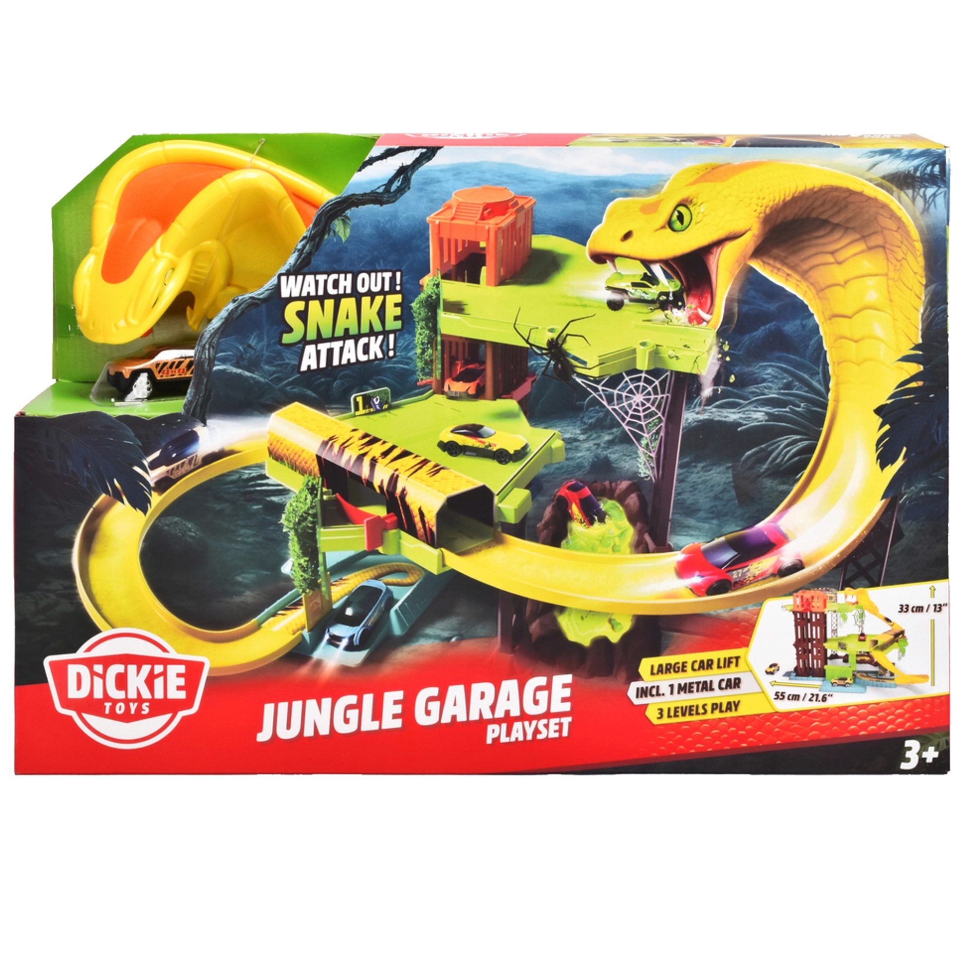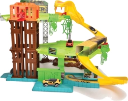 Begeben Sie sich auf eine spannende Fahrt durch den Dschungel und erkunden Sie alle drei Ebenen der Bahn, wo eine riesige Schlange lauert. Die Rennbahn von Dickie Toys ist für dynamisches Spielen mit flüssigen Abfahrten und Auffahrten konzipiert, und dank des beweglichen Aufzugs lässt sich das Auto leicht zwischen den Etagen versetzen.