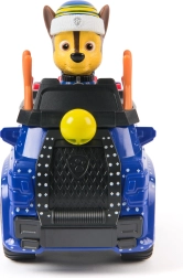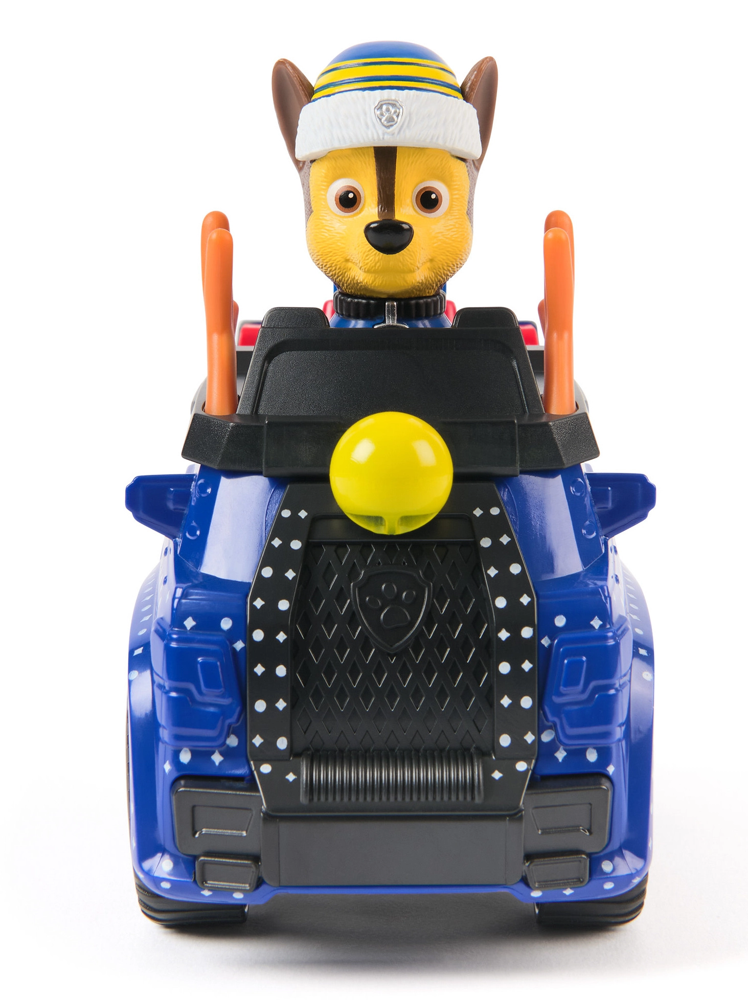 Detailreiches blaues Fahrzeug mit weihnachtlichen Elementen und beweglichen Rädern. Die CHASE-Figur mit Wintermütze sitzt direkt im Cockpit und ist einsatzbereit.