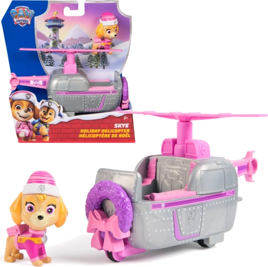 Der Weihnachtshelikopter von Skye aus dem Hause Spin Master bringt Kindern die authentische Atmosphäre der Serie PAW PATROL nach Hause. Der stilvolle grau‑rosafarbene Hubschrauber mit festlichem Kranz an der Front verfügt über ein öffnendes Cockpit, in das die Skye-Figur mit Wintermütze gesetzt werden kann. Dank drehbarem Rotor und drei Rädern gelingen Landungen ebenso wie „Flüge“ durch das Kinderzimmer.