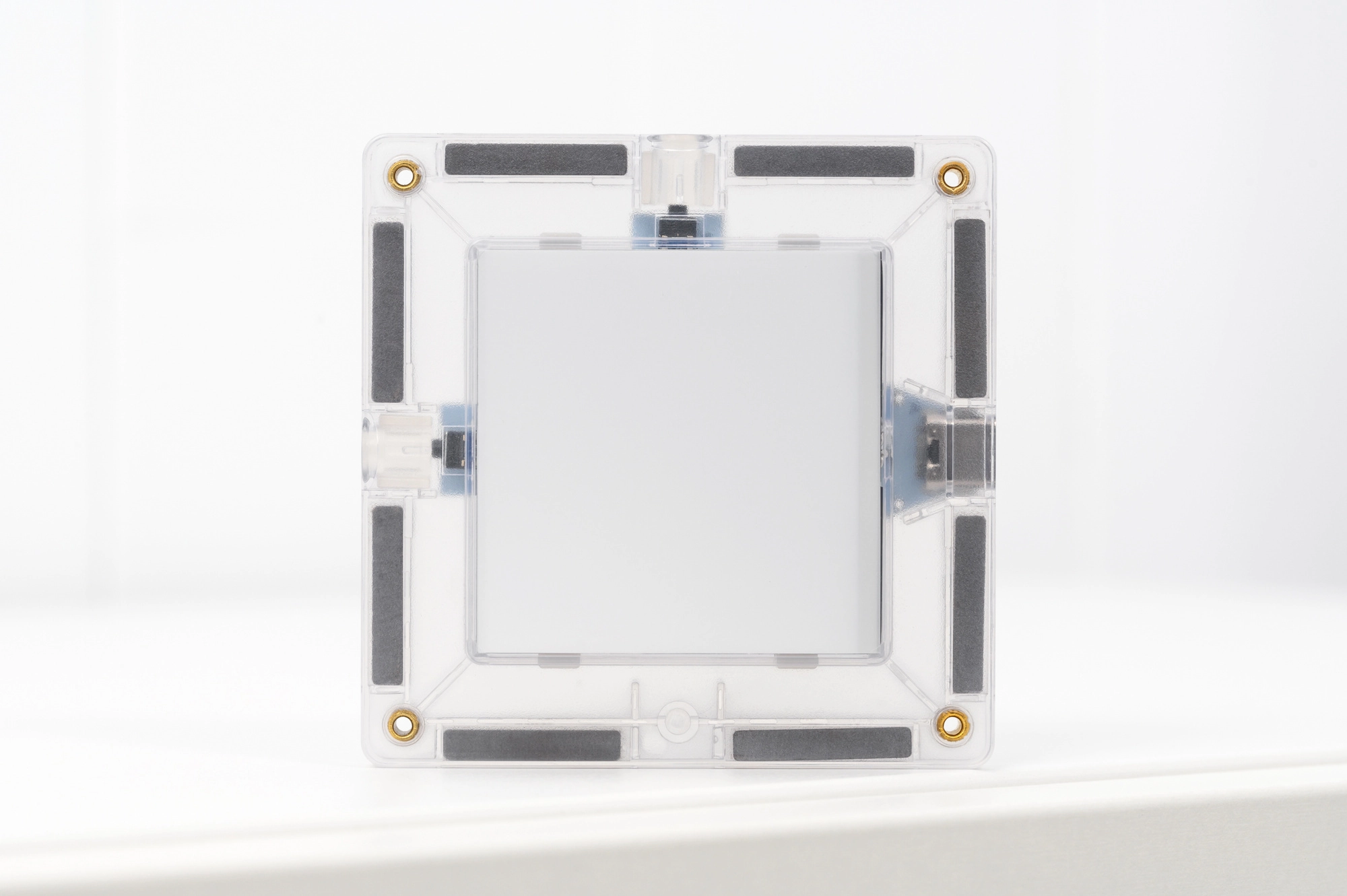 Im Set enthalten ist ein beleuchtetes Quadrat, das die transluzenten Teile erstrahlen lässt und sensorisches Spiel sowie kreative Experimente mit Licht und Farben unterstützt.