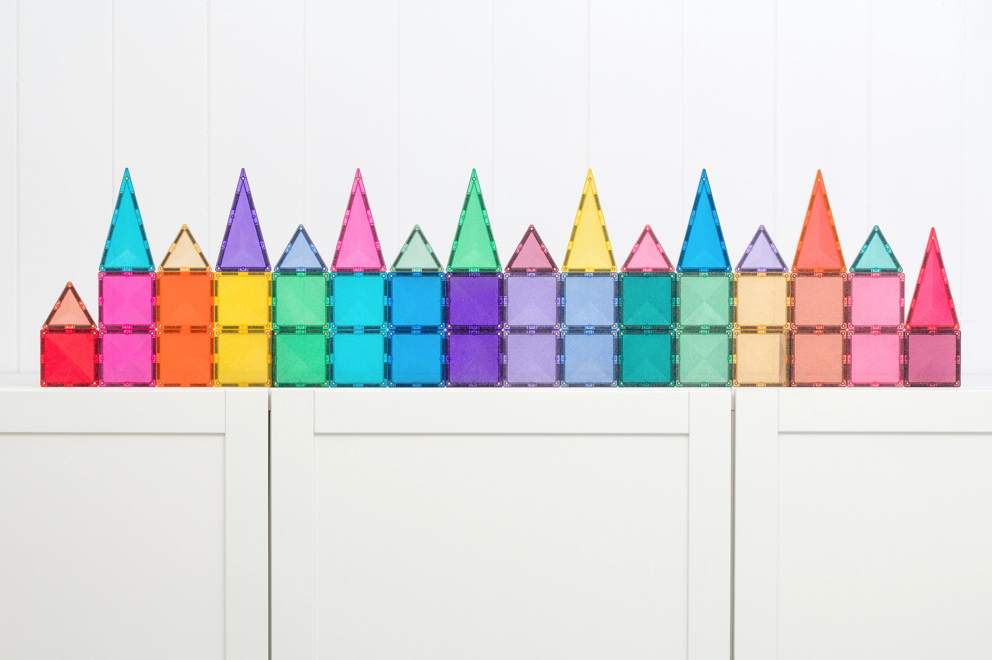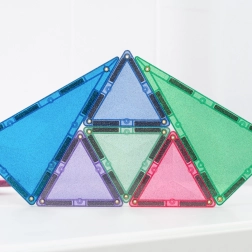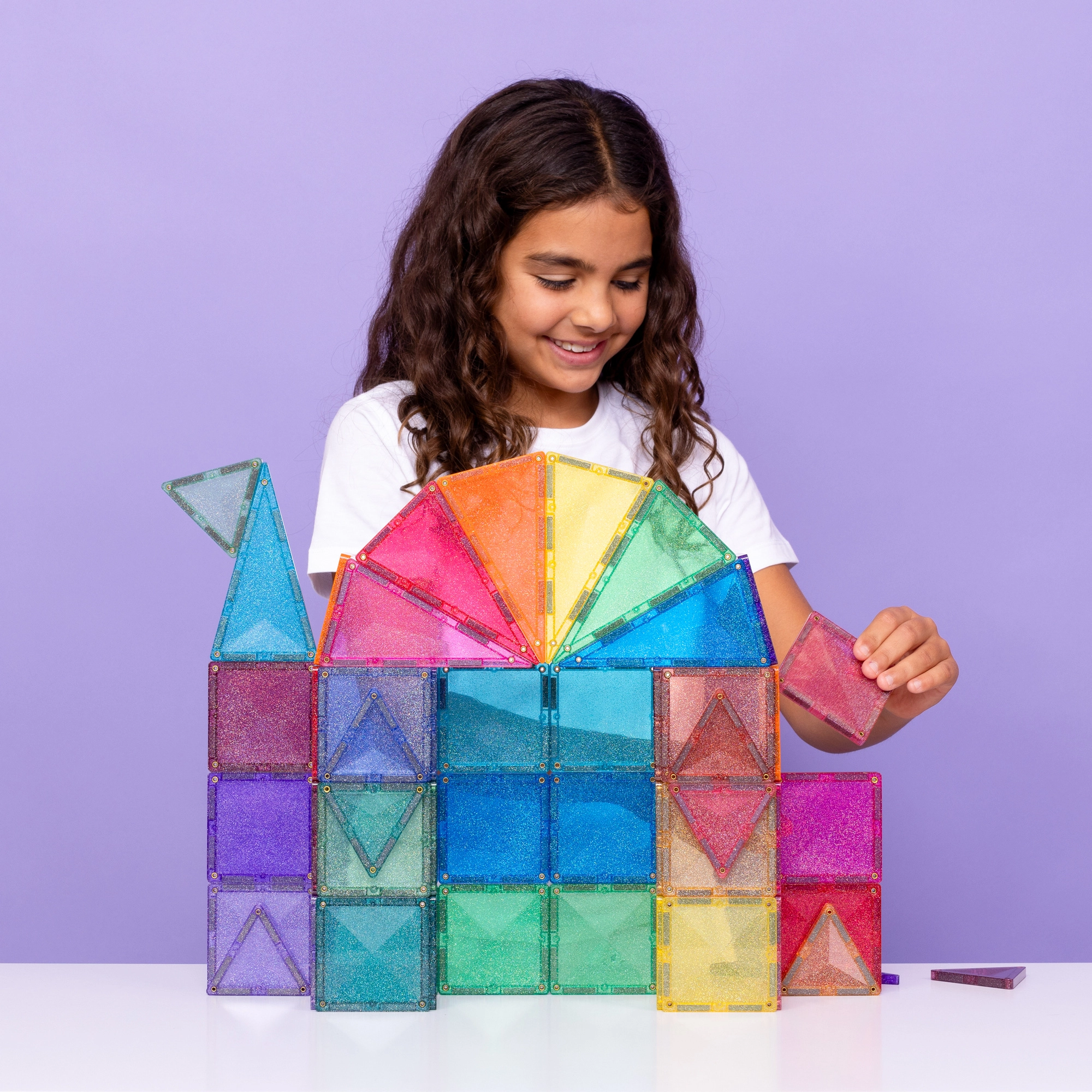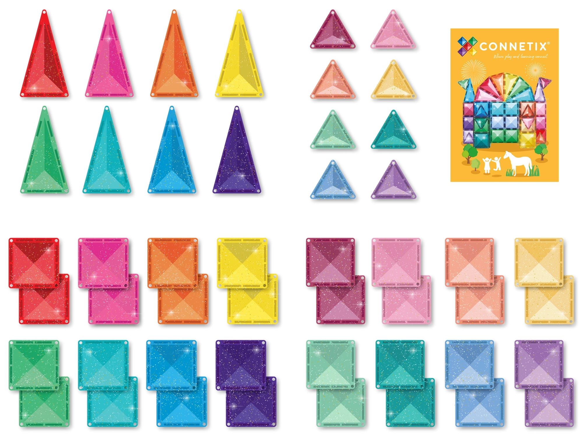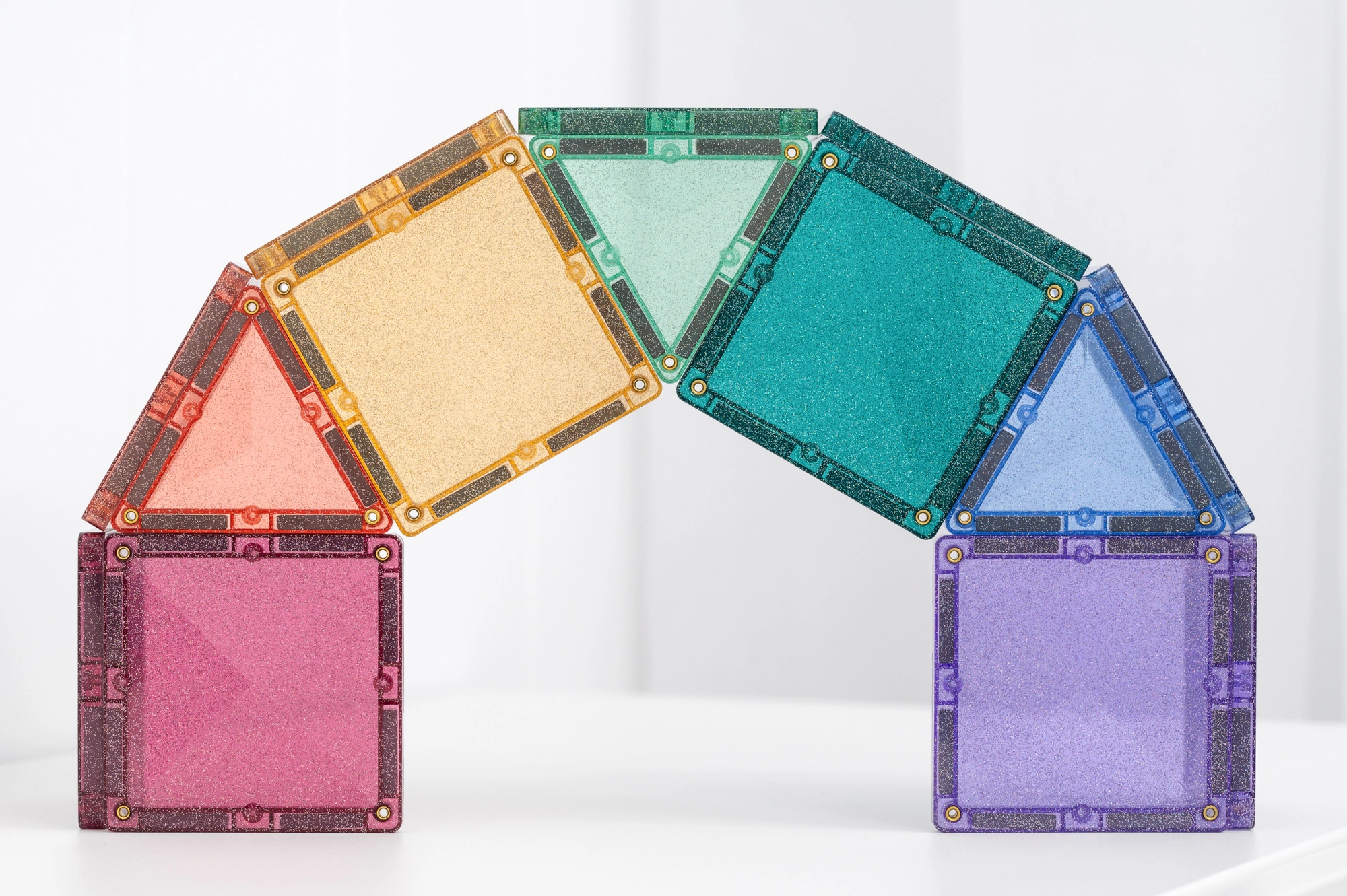 Das Set enthält 48 hochwertige, glitzernde Magnetbauteile, die sich dank Magneten entlang des Randes von allen Seiten anziehen und stabile Konstruktionen ermöglichen. Die transparent farbigen Platten aus strapazierfähigem ABS ohne BPA und Phthalate sind ideal für sicheres Spielen ab 3 Jahren und sorgen für ein freudiges „Klick“ beim Verbinden.