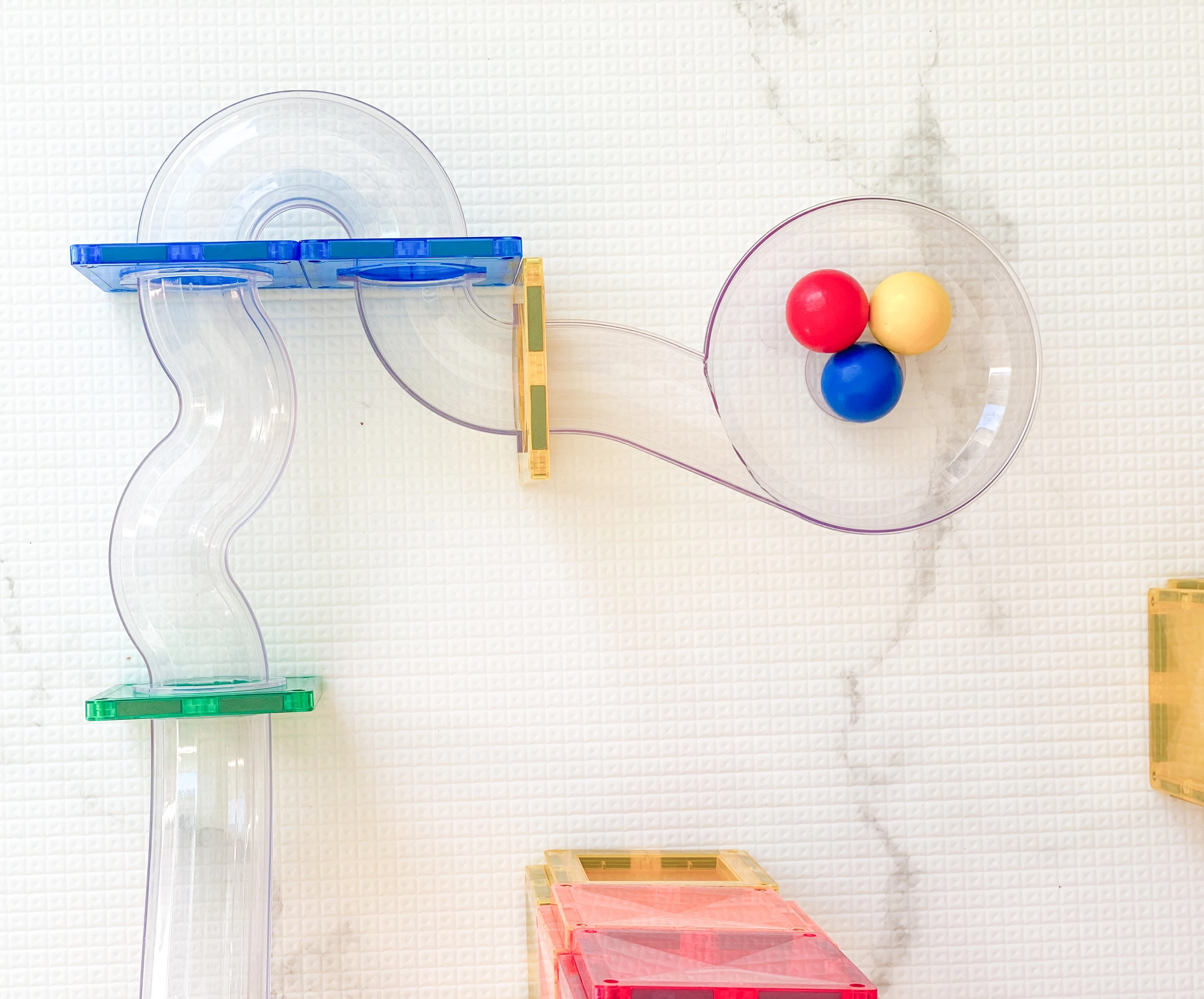 Klare Röhren, Kurven, S-Formen und Y-Verteiler ermöglichen es, die Bewegung der Kugeln zu verfolgen und Geschwindigkeit, Gravitation sowie Ursache und Wirkung in verschiedenen Aufbauten zu erforschen.
