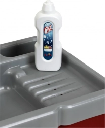 Einfach den Tank füllen und den Regler drehen – das Wasser fließt wie bei einem echten Spülbecken. Kinder können sicher das Abwaschen von Tellern und Besteck ausprobieren.