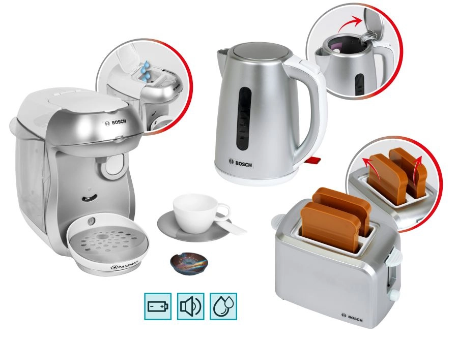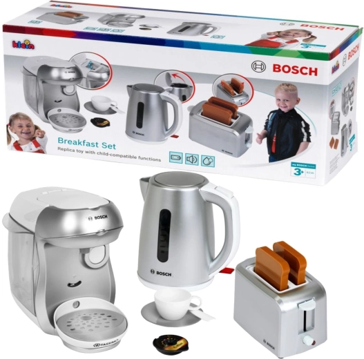 Das stilvolle Frühstücksset für kleine Köche der Marke BOSCH mini enthält eine Kaffeemaschine mit echtem Wasserfluss, einen Toaster mit herausspringenden Toastscheiben und einen Wasserkocher mit öffnendem Deckel. Dank realistischer Funktionen und Soundeffekten können Kinder alltägliche Hausarbeiten sicher nachspielen und ihre Fantasie sowie Motorik fördern.