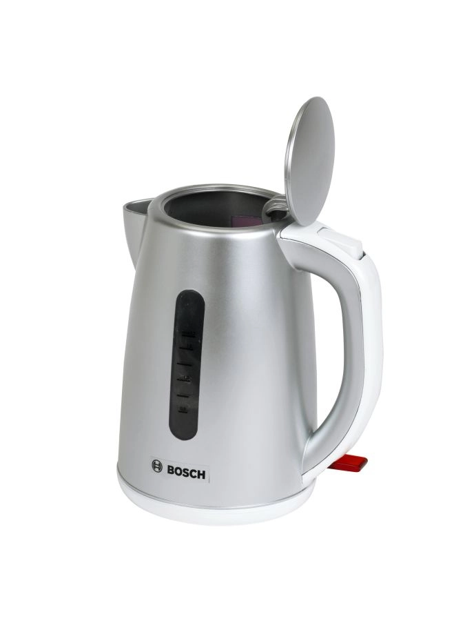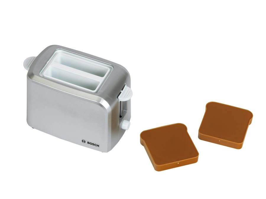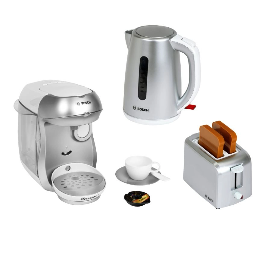Zum Set gehört außerdem ein kompakter Toaster in Grau mit automatischem Herausspringen von zwei Toasts, Hebemechanismus und Drehregler mit imitierter Einstellung. Abgerundet wird das Set durch einen elektrischen Kinder-Wasserkocher mit öffnendem Deckel und Schalter für ein noch realistischeres Spiel.
