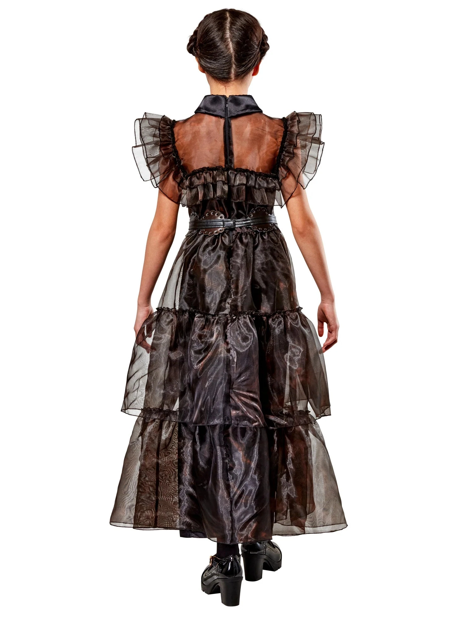 Offiziell lizenziertes Kostüm, inspiriert von der Serie WEDNESDAY, mit dem jedes Mädchen den ikonischen Rave’n Dance erleben kann. Enthalten sind ein schwarzes Kleid mit Ziergürtel und gotischen Details – ideal für Karneval, Halloween und Mottopartys. Bequemer Schnitt, leichter mehrlagiger Stoff und elegante Rüschen sorgen für einen stilvollen Look und Komfort beim Tanzen.