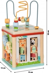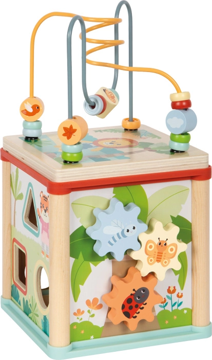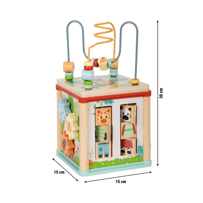 Dieser hochwertige Motorikwürfel aus 100% FSC-Holz vereint mehrere unterhaltsame Aktivitäten in einem kompakten Spielzentrum. Dank des abnehmbaren Deckels mit Perlenlabyrinth, der umgedreht im Inneren verstaut werden kann, ist er ideal auch für kleinere Kinderzimmer. Sorgfältig abgerundete Kanten, eine stabile Konstruktion und angenehme Farben mit Tiermotiven schaffen eine sichere und anregende Umgebung zum Entdecken.
