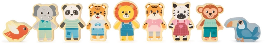 Mit dabei sind niedliche Tierfiguren – Tiger, Panda, Äffchen, Vögel und weitere – die zum Geschichtenerzählen und freien Spiel inspirieren.