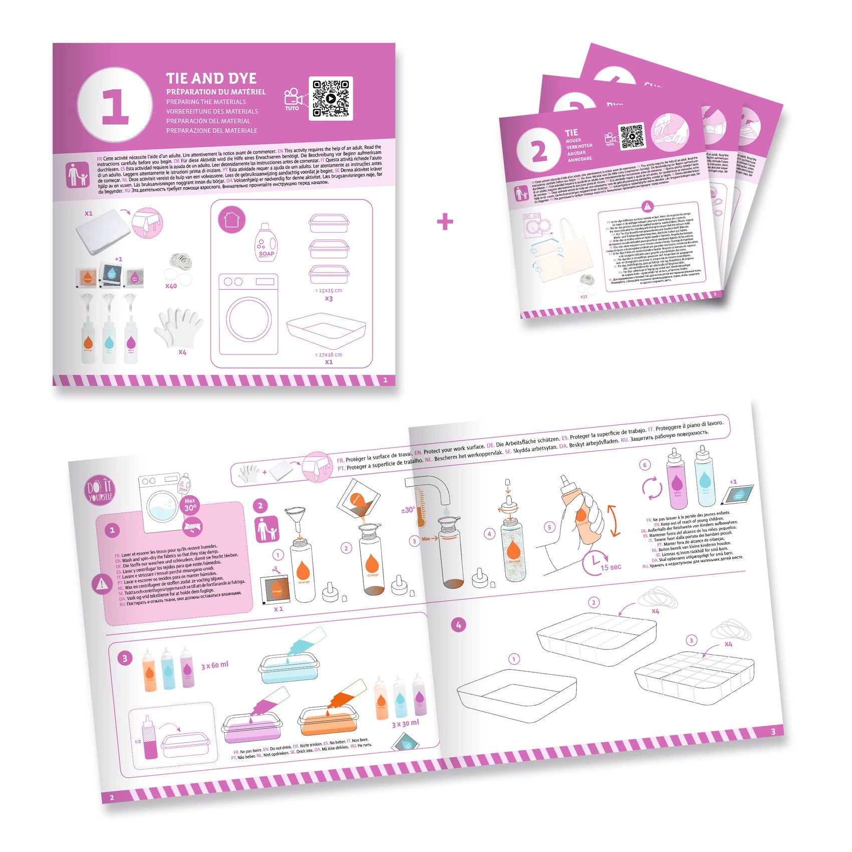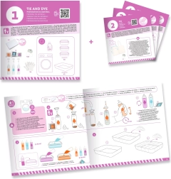 Das Set enthält Farben, Zubehör und übersichtliche Anleitungen – einfach öffnen und mit einzigartigen Batikstücken loslegen.