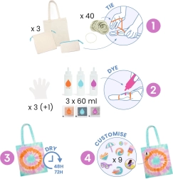 In der Verpackung finden Sie alles für einen bequemen Start: Farben, Schutzhilfen und Anleitung. Das Ergebnis sind bunte, langlebige Motive, die Taschen, Beutel und Federmäppchen schmücken. Ein toller Tipp für einen kreativen Nachmittag zu Hause oder als Geschenk für kleine Designer.