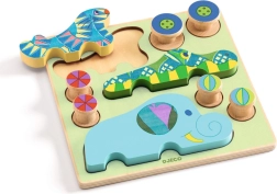 Entdecken Sie das verspielte Einlegepuzzle mit Tieren in Autos von Djeco. Die Teile sind an kleine Kinderhände angepasst, haben glatte Kanten und ansprechende Farben, die die Wahrnehmung von Formen und Farben fördern. Nach dem richtigen Einsetzen der Teile kann sich das Puzzle „in Bewegung setzen“, was eine zusätzliche Dimension des Spielspaßes bringt.