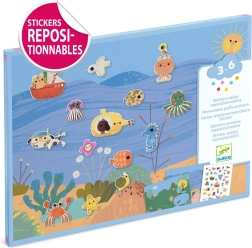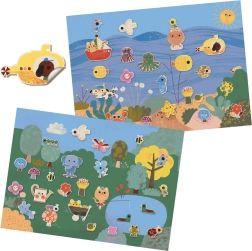 Dieses kreative Set bietet zwei illustrierte Hintergründe – die Unterwasserwelt und den Wald mit Teich – sowie einen Bogen niedlicher Sticker mit Fischen, Krabbe, U-Boot, Boot, Waldtieren und weiteren Motiven. Kinder können die Sticker nach Belieben versetzen und immer neue Geschichten erfinden.