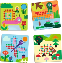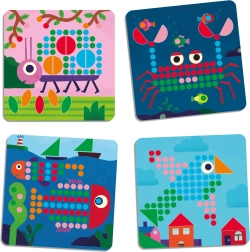 Dieses kreative Mosaik-Set von DJECO ermöglicht Kindern, mithilfe farbiger Stifte und Halbkugeln spielend leicht niedliche Motive zu legen. Einfach die illustrierte Karte auf die perforierte Holztafel legen und die Teile in die Öffnungen stecken – schon erwacht das Bild zum Leben. Das Spiel fördert Geduld, Konzentration und den richtigen Griff.