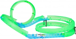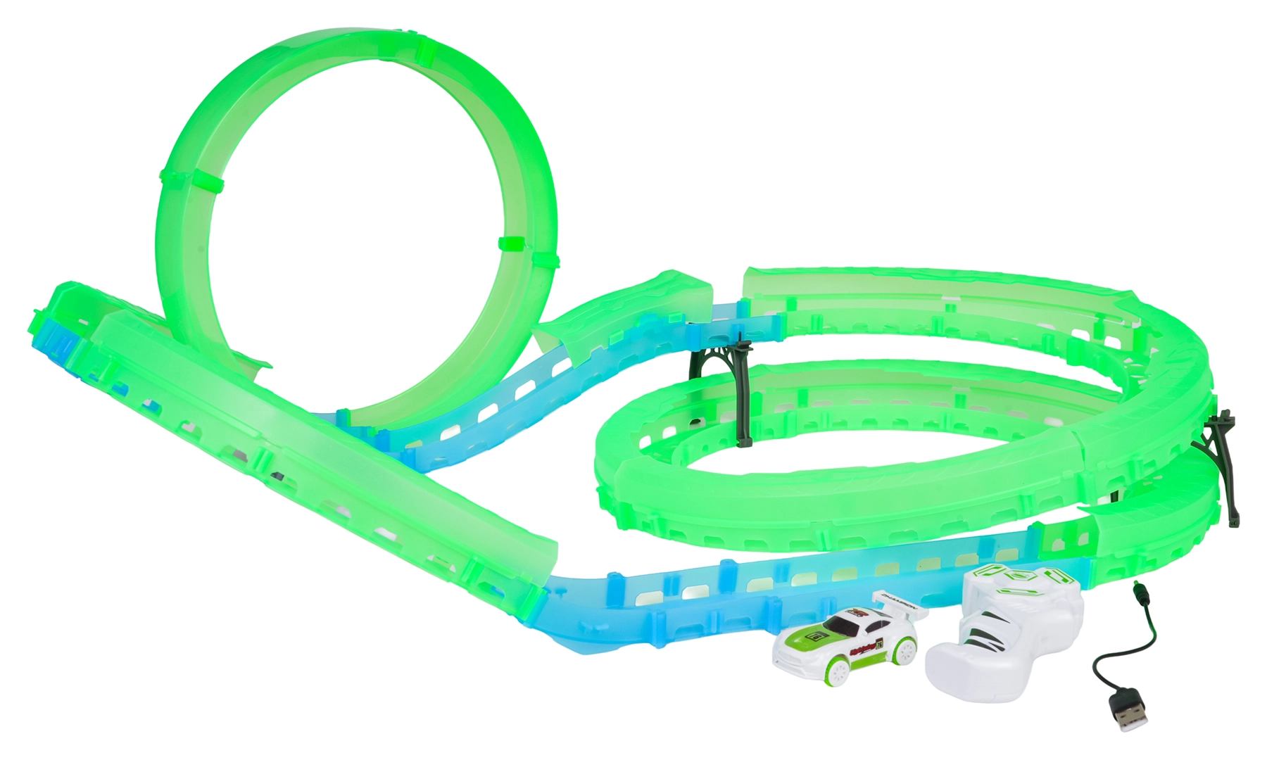 • Spaß bei Tag und Nacht – die fluoreszierende Strecke leuchtet im Dunkeln, das LED-Auto bringt jeden Kurs zum Strahlen.