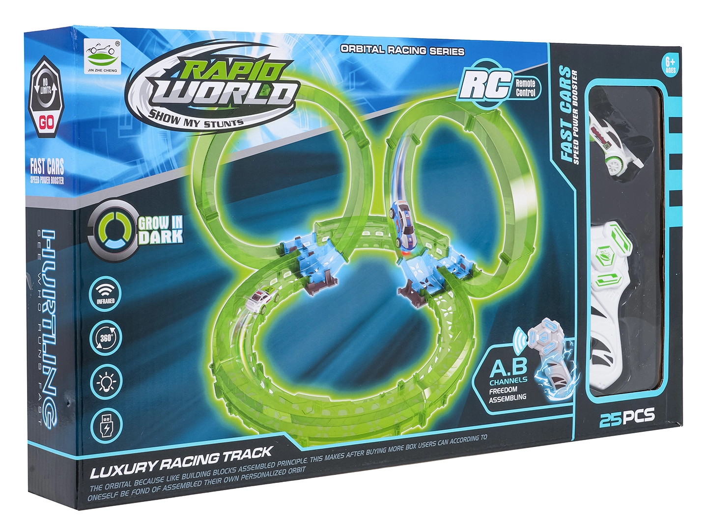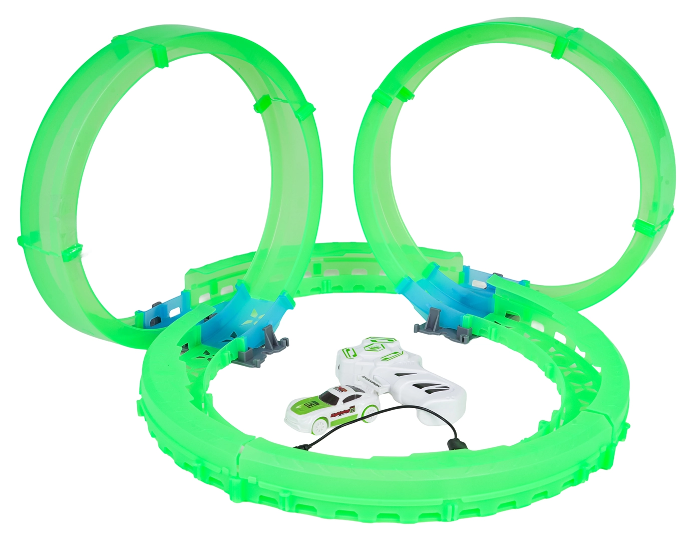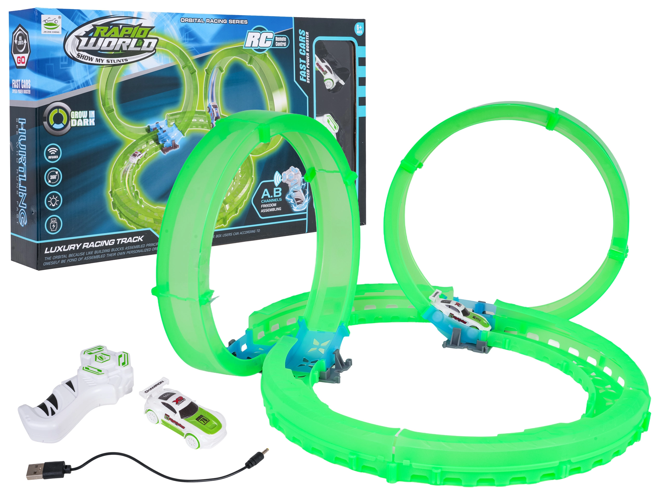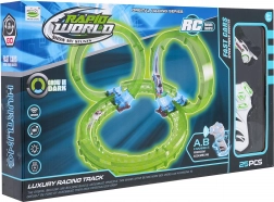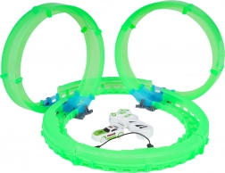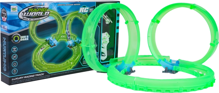 Entdecken Sie den Spaß mit dem Set einer leuchtenden Rennbahn mit ferngesteuertem Auto. Die fluoreszierende Bahn leuchtet im Dunkeln, das Auto hat eine LED-Beleuchtung und wird über USB geladen. Ein großartiges Spiel, das die Koordination und Vorstellungskraft von Kindern ab 6 Jahren fördert.