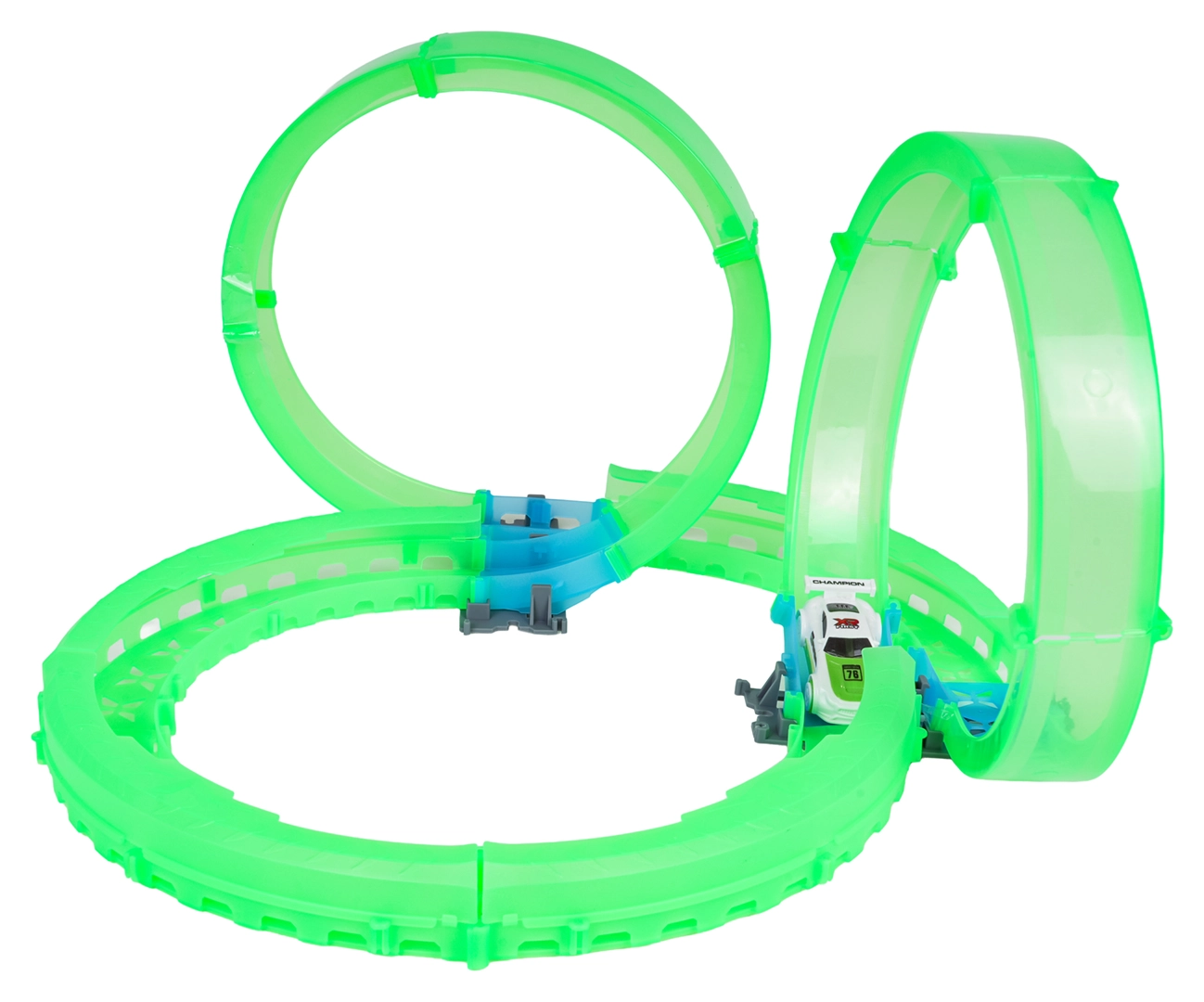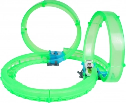 Transluzente Bahnteile leuchten im Dunkeln und ermöglichen eine effektvolle Fahrt voller Loopings und Kurven.