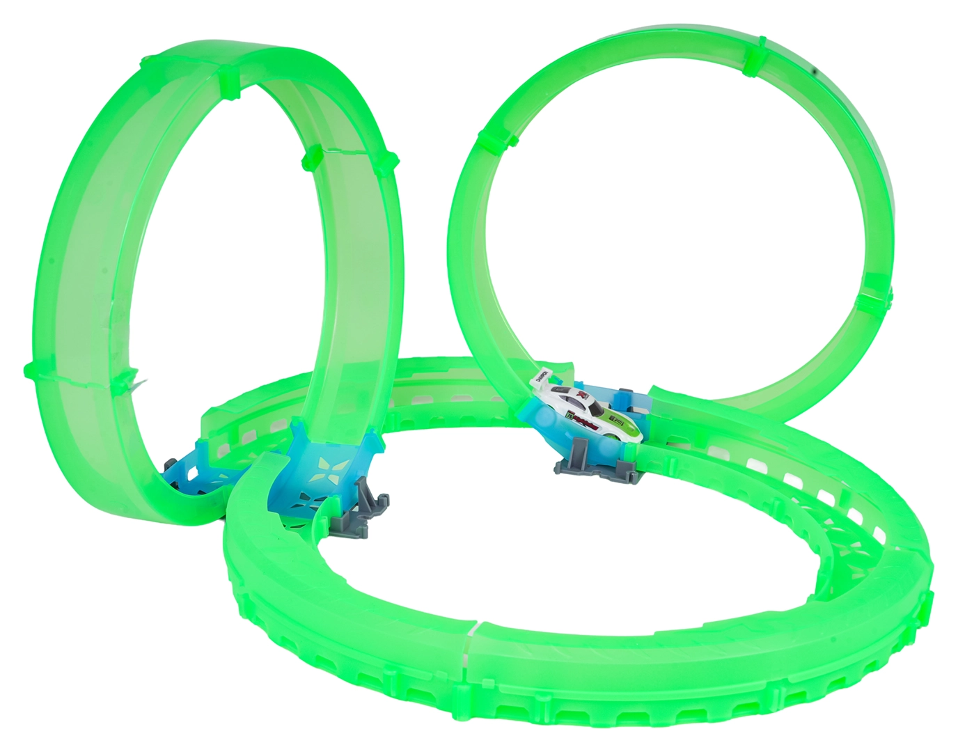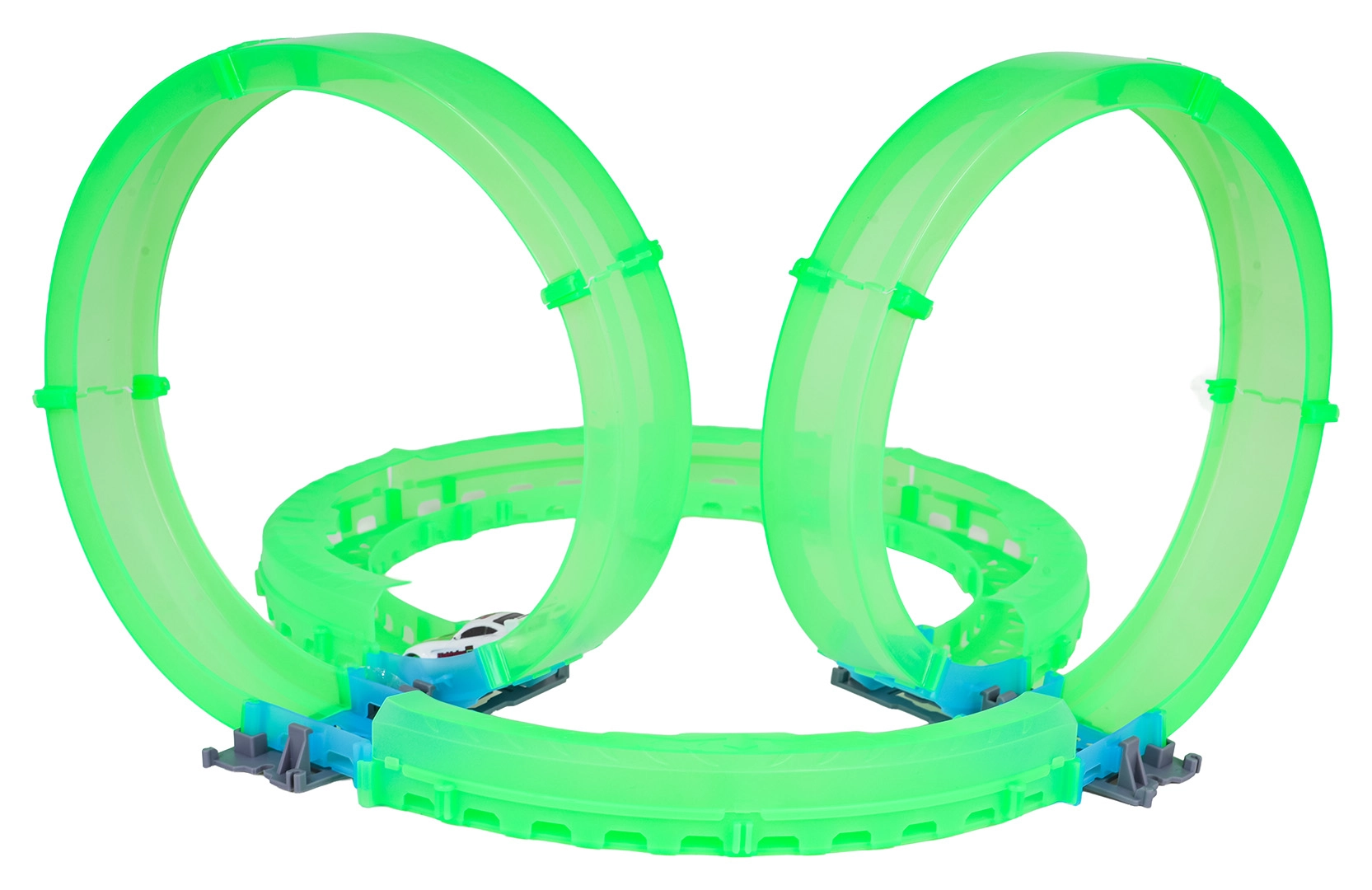 Modulare Teile und Stützen halten die Bahn fest an Ort und Stelle, damit das Auto hohe Geschwindigkeiten und Loopings meistert.