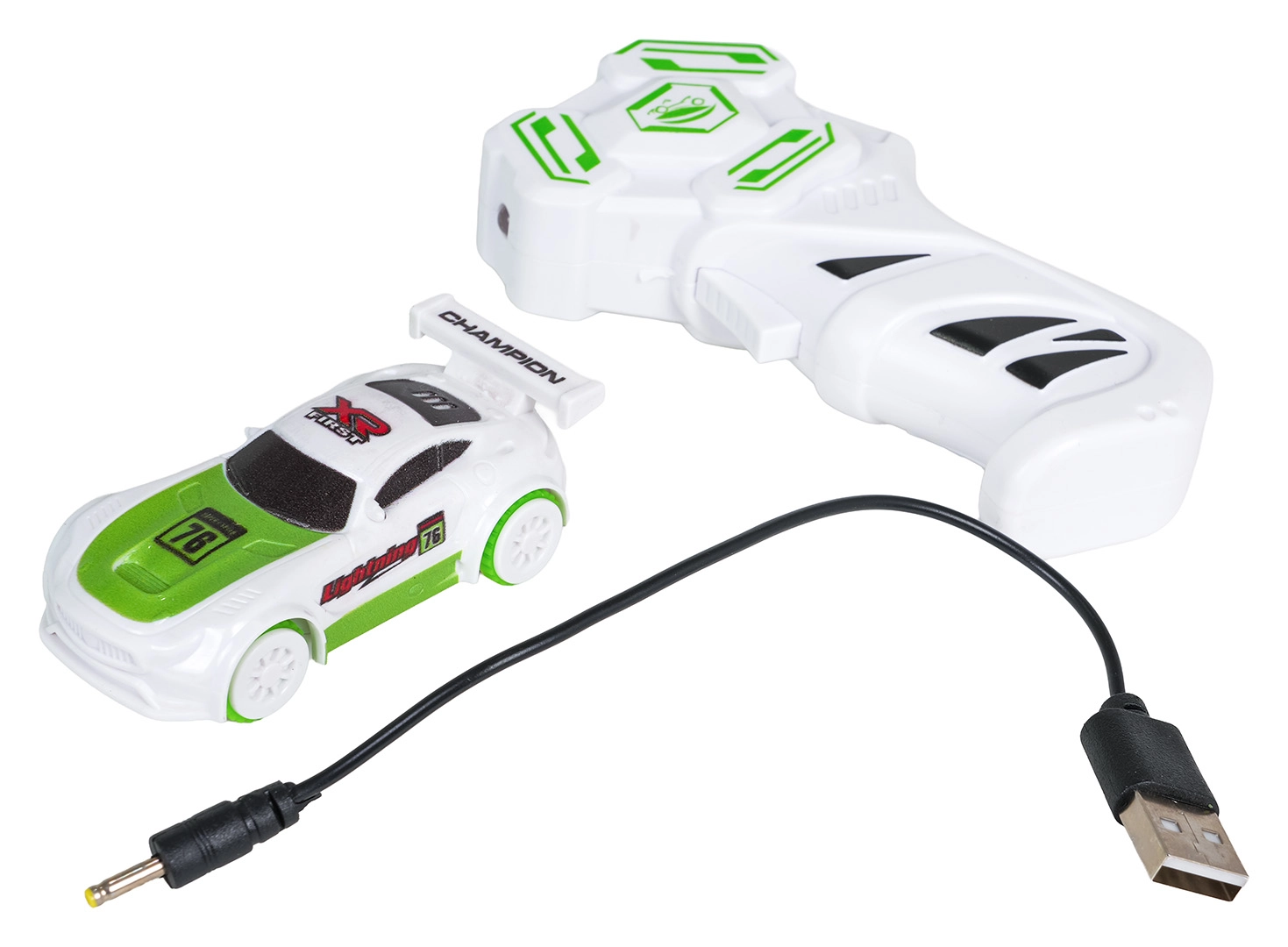 Das kompakte Rennauto mit LED-Beleuchtung steuern Sie mit der beiliegenden Fernbedienung. Das Laden erfolgt über das mitgelieferte USB-Kabel.