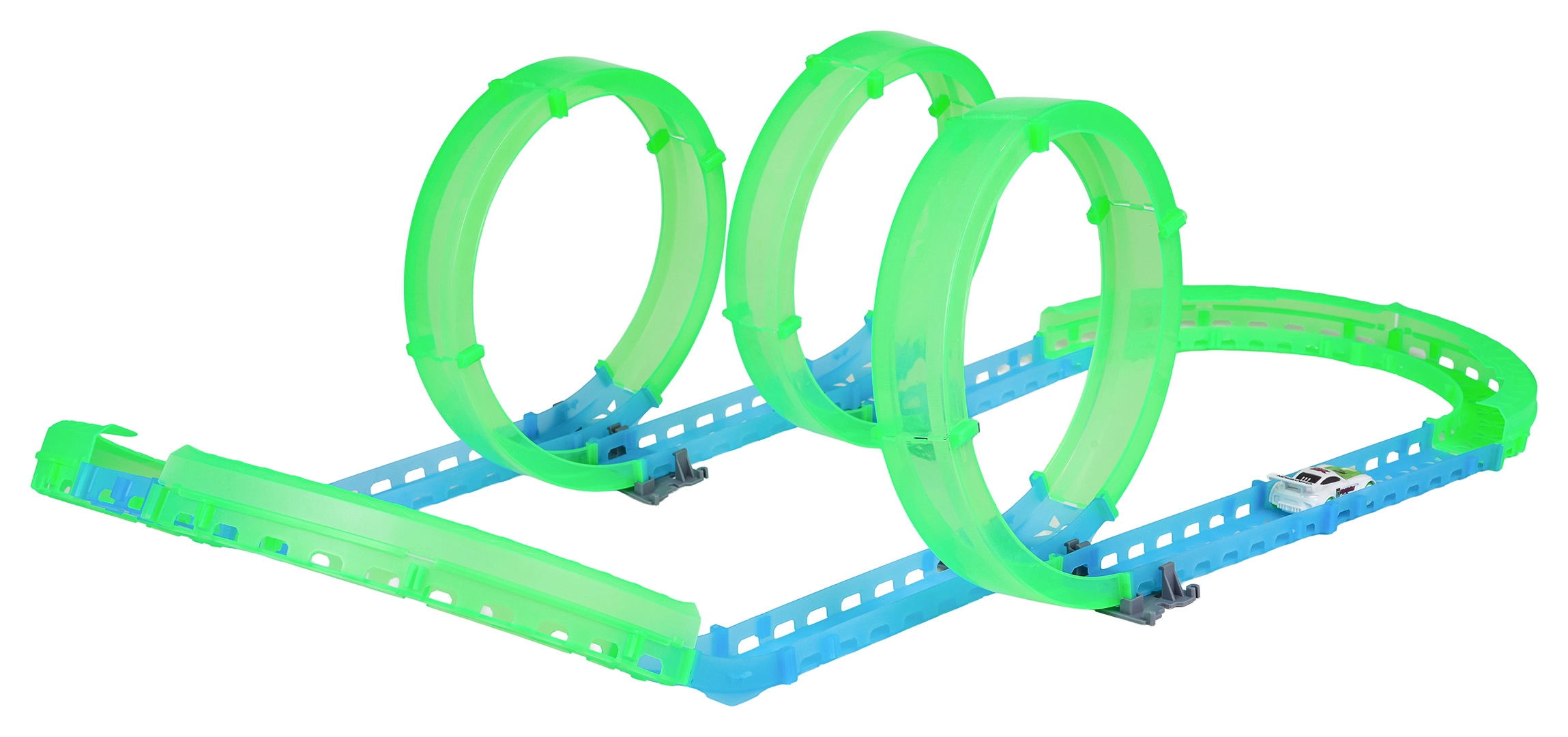 Baue deine eigene Stuntstrecke und fahre auch nach Einbruch der Dunkelheit. Fluoreszierende Elemente leuchten im Dunkeln und das kleine RC-Auto fährt vorwärts auf der vorbereiteten Strecke. Dank LED-Beleuchtung entstehen während der Fahrt effektvolle Lichtspuren.