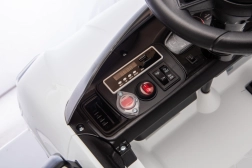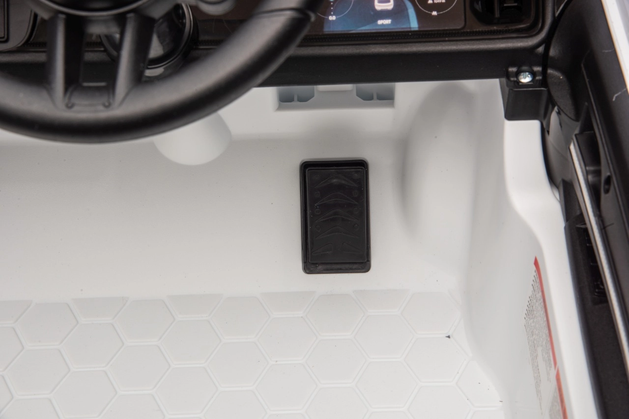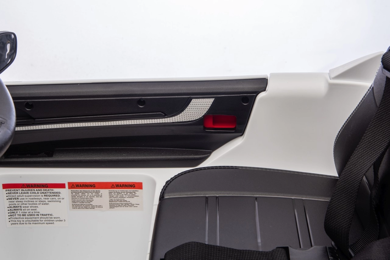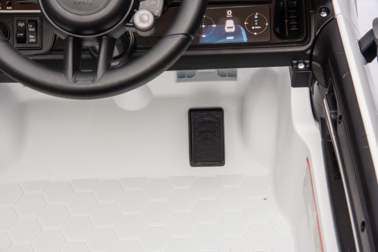 Für maximale Sicherheit für Eltern und Kinder gibt es eine 2,4-GHz-Fernbedienung mit drei Geschwindigkeiten und einer Not-Stopp-Taste. Das Interieur begeistert mit einem schwarzen Sitz aus Kunstleder mit Gurt, einem Funktionspanel mit MP3/Bluetooth/FM sowie Hup- und Soundtasten am Lenkrad. Öffnende Türen, LED-Leuchten und hochwertige Verarbeitung sorgen für einen attraktiven Look und täglichen Spielspaß.