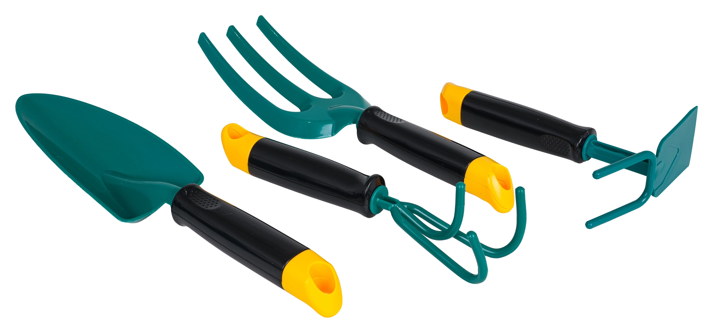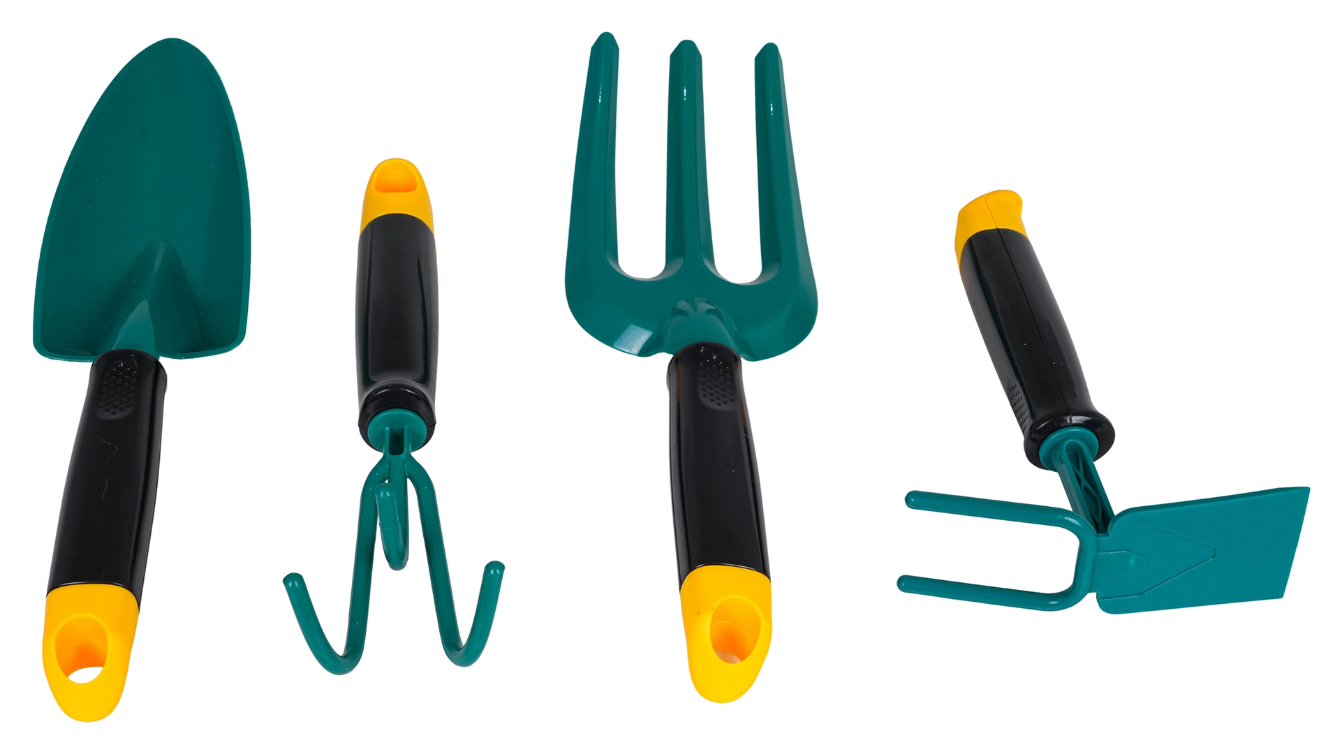 Schaufel, Harke, Kultivator und Hacke verfügen über ergonomische, rutschfeste Griffe und glatte Kanten für die sichere Nutzung durch kleine Hände.