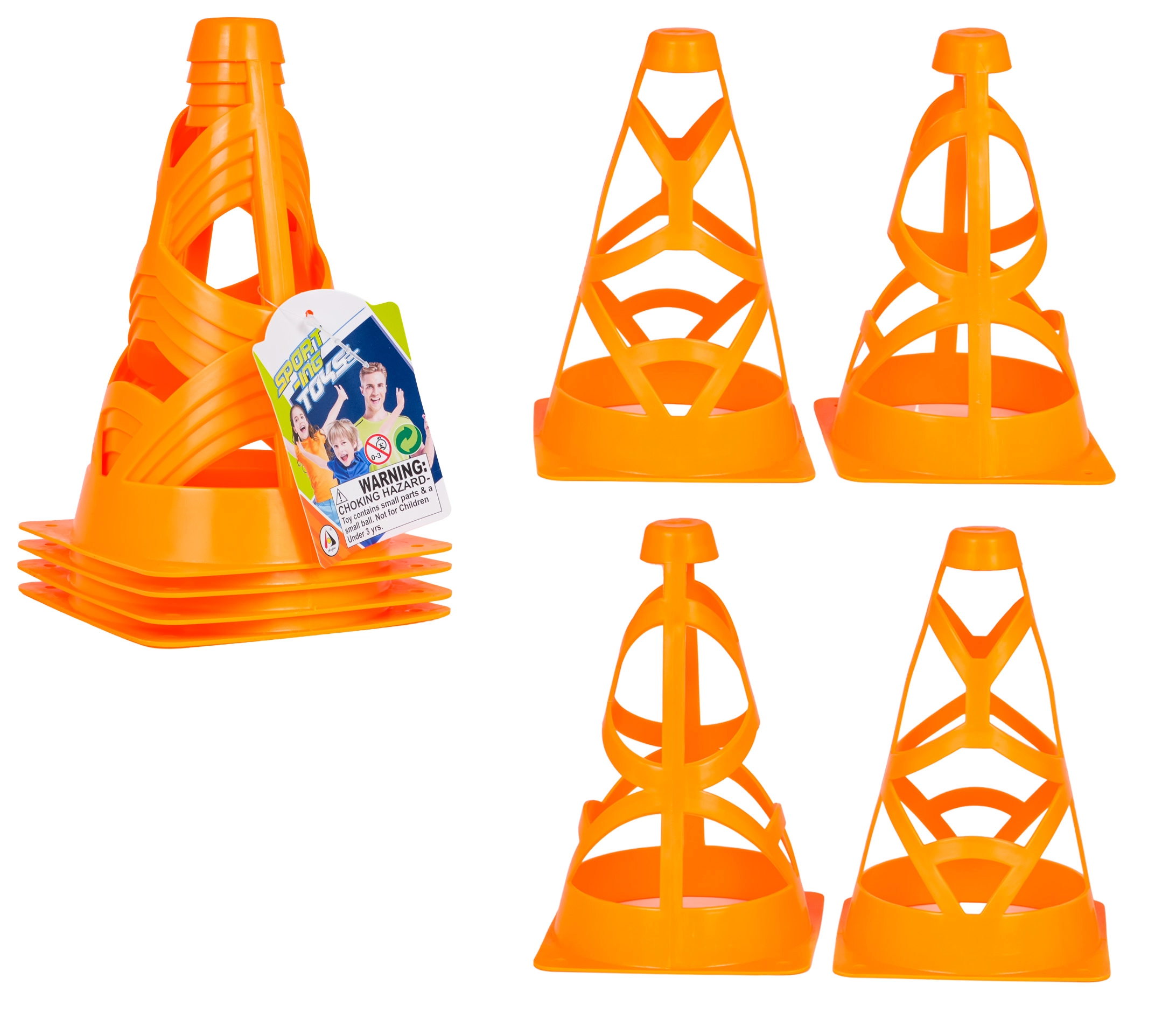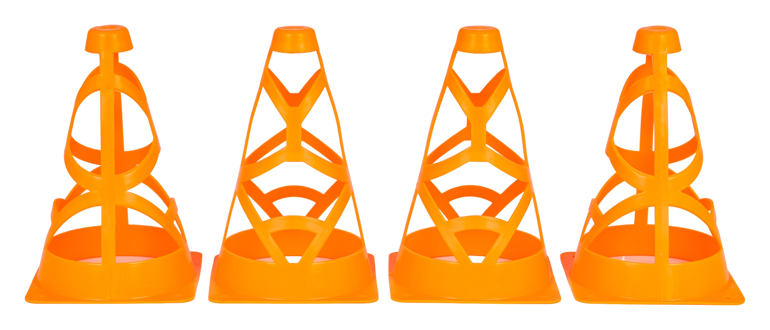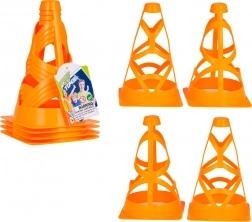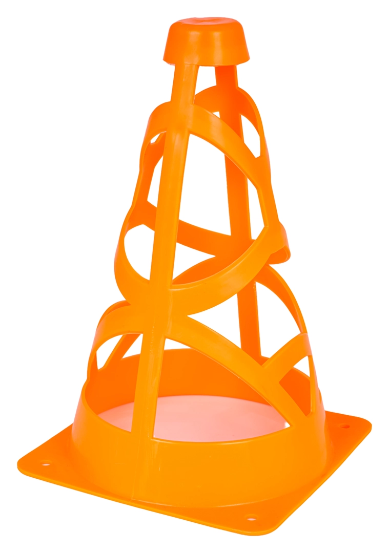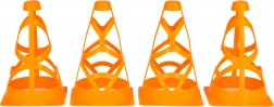 Set aus vier orangefarbenen Kegeln für Kinder ab 3 Jahren und erwachsene Sportler. Sie sind leicht, stapelbar und dank der leuchtend orangefarbenen Farbe hervorragend sichtbar. Die offene Konstruktion mit Befestigungsöffnungen sorgt auch bei Wind für Stabilität. Geeignet für Fußballtraining, Agility-Übungen und das Abstecken von Zonen auf dem Spielfeld oder im Hof.