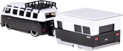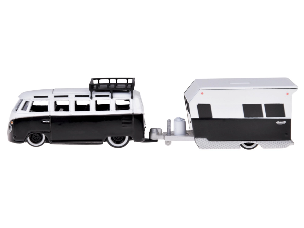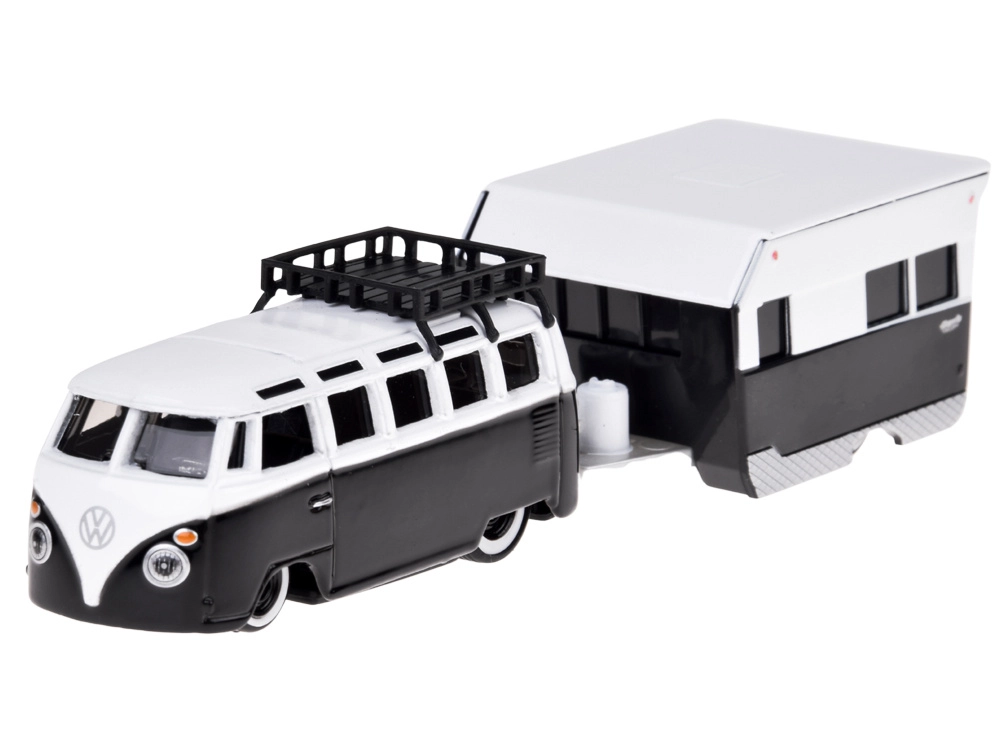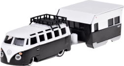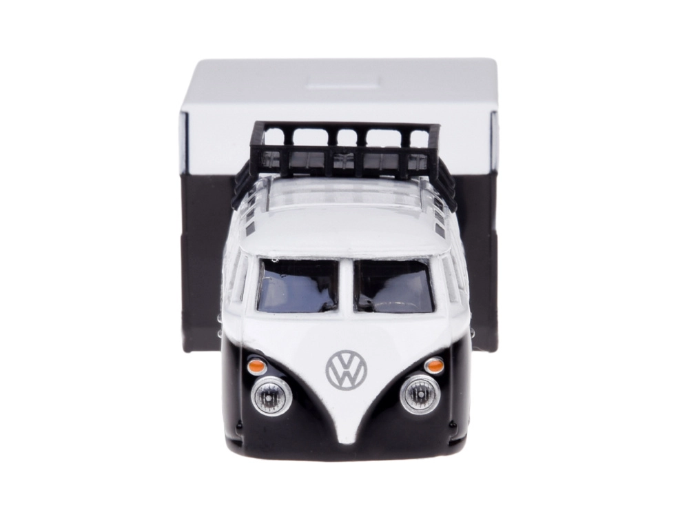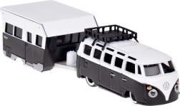 Das Set kombiniert den ikonischen VOLKSWAGEN‑Kleinbus mit einem detaillierten Camping‑Anhänger. Ideal für die Sammlung und fantasievolles Spielen.