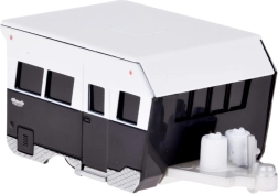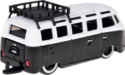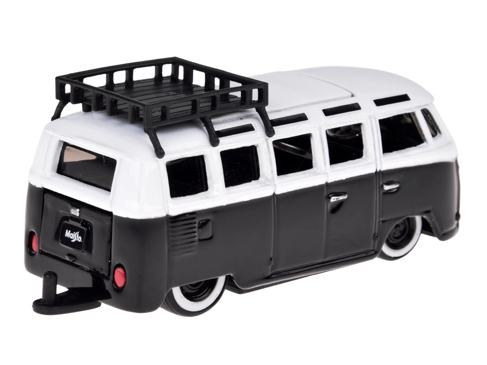 Metallkarosserie, realistische Fenster, Räder und Dachgepäckträger. Präzise Proportionen und dezente schwarz‑weiße Farbgebung betonen den Retro‑Charakter.