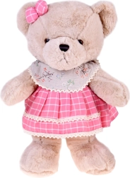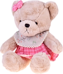 Bär Zuzia verzaubert mit weichem beigefarbenem Fell, einer rosa Schleife am Ohr und einem Kleid im Karomuster mit Spitzenabschluss. Dank des kuschelweichen Plüschs eignet er sich perfekt zum Schmusen und Beruhigen vor dem Schlafengehen und ist zugleich eine charmante Dekoration fürs Kinderzimmer.