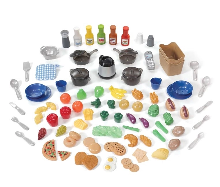 Tassen, Teller, Pfannen, Lebensmittel und Utensilien – alles, was Kinder für kreatives Kochen und Servieren brauchen.