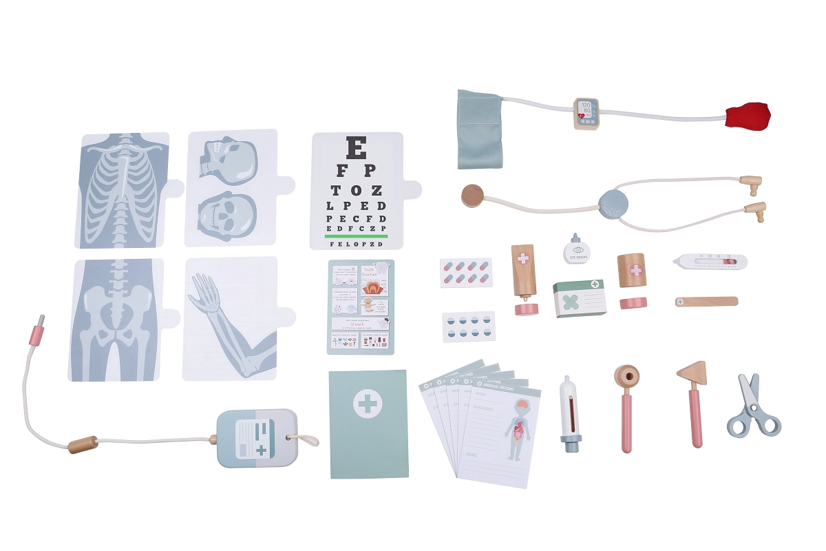 Stethoskop, Blutdruckmessgerät, Thermometer, Otoskop, Spritze, Reflexhammer, Schere, Pinzette, Infusion, Patientenkarteikarten, Sehtafel, Medikamentenkarten und weiteres Zubehör für ein komplettes Rollenspiel.