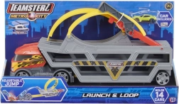 Verwandeln Sie jede Fahrt in Action. Der TEAMSTERZ-Transporter dient nicht nur zum Transport der Autos, sondern auch als vollwertige Rennbahn. Auf der Oberseite finden Sie einen gelben Looping, der sich leicht aufbauen lässt, sowie eine Rampe für spannende Sprünge. Dank des Aufziehauslösers schicken Sie das Auto mit maximaler Geschwindigkeit durch den Looping.