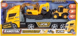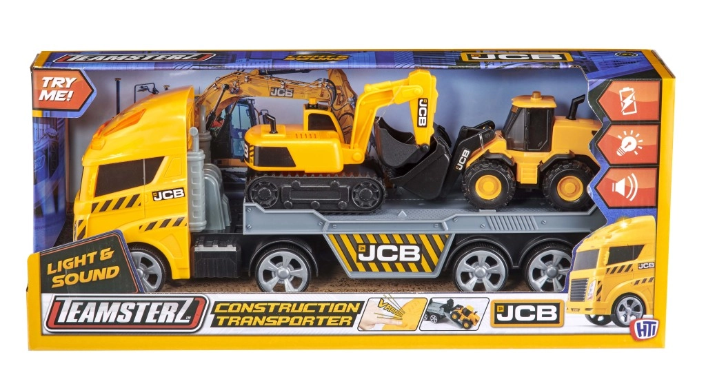 JCB Transport-Set bietet Kindern ein realistisches Baustellenerlebnis: gelber Transporter mit blinkenden Lichtern und Motorsounds, frei beweglichen Rädern sowie zwei Maschinen – Bagger und Radlader mit manuell bedienbaren Schaufeln für kreatives Spiel und die Förderung der Feinmotorik.
