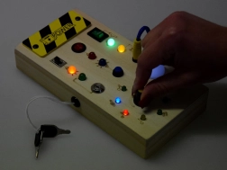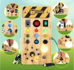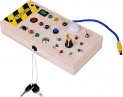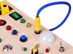 Mehrfarbige LED-Dioden in mehreren Nuancen lassen das Brett aufleuchten, wenn Tasten oder Schalter korrekt betätigt werden, und vermitteln Kindern die Prinzipien von Ursache und Wirkung sowie die Farberkennung.