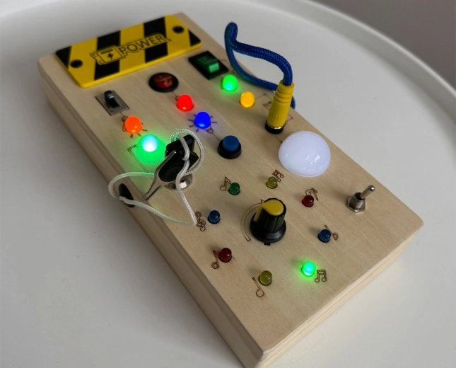 Diese Montessori-Aktivtafel aus Holz verbindet praktisches Lernen und sensorisches Spiel. Kinder stecken das Kabel ein, drücken Tasten, betätigen Schalter und beobachten, wie die farbigen LEDs reagieren – so verinnerlichen sie spielerisch Ursache–Wirkung und trainieren Feinmotorik sowie Hand-Auge-Koordination.