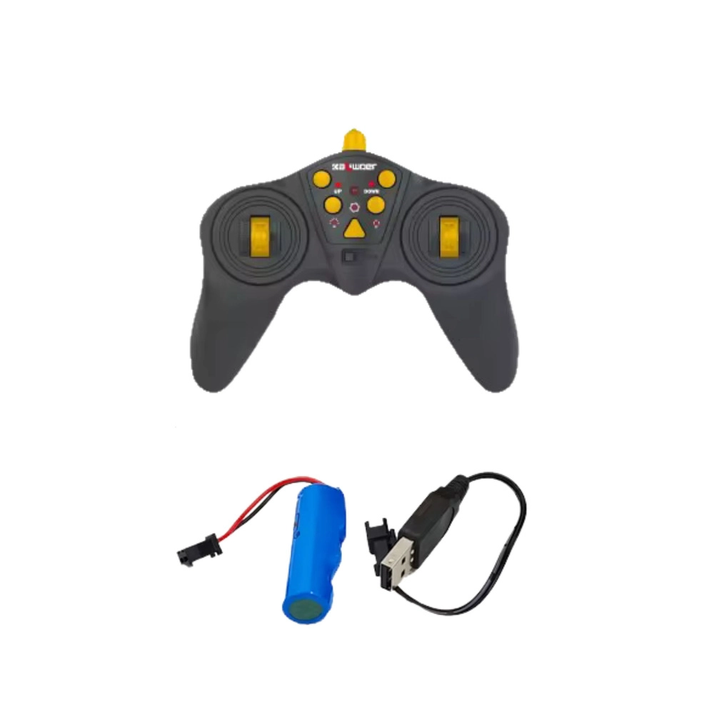 Im Set enthalten sind eine Zweijoystick-Fernsteuerung, ein 3,7-V-Akku zum Aufladen und ein USB-Kabel – einfach AA-Batterien in die Fernsteuerung einsetzen und losfahren.
