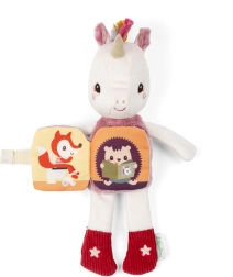 Das integrierte Textilbüchlein mit Bildern unterstützt das erste Verständnis von Geschichten, die Sprachentwicklung und die visuelle Wahrnehmung.