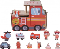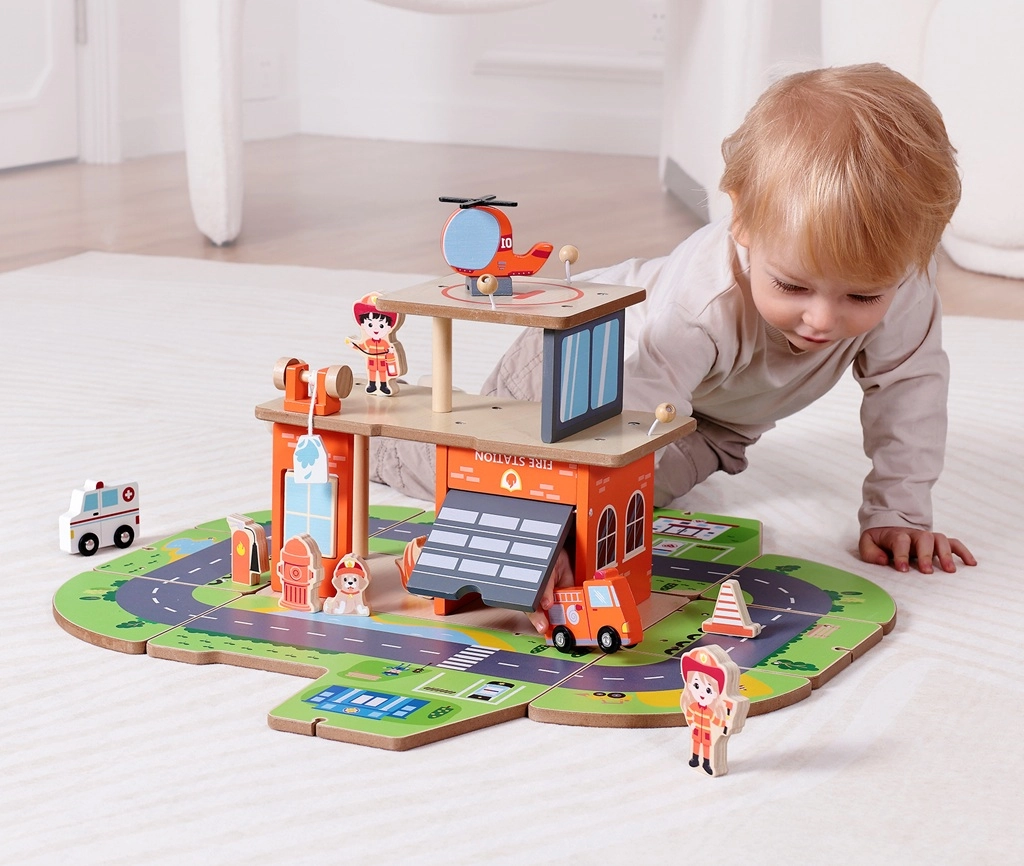 Das Spielzeug besteht aus hochwertigem Holz und Metallelementen für erhöhte Langlebigkeit. Enthalten sind 13 farbige Teile inklusive Feuerwehrfiguren, Fahrzeuge, Zubehör und Rettungsausrüstung. Ideal für Kinder ab 3 Jahren, fördert Feinmotorik, Hand-Auge-Koordination und Teamarbeit.