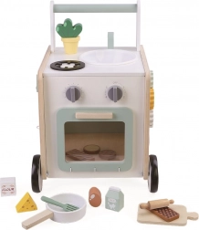 Dieser multifunktionale Holz-Lauflernwagen dient als Stütze bei den ersten Schritten und zugleich als vollwertiges Spielzentrum mit Küchenelementen. Kinder trainieren Hand-Auge-Koordination, Balance und Feinmotorik, während sie die Welt des Kochens und Rollenspiels entdecken. Die Drehknöpfe am Ofen erzeugen ein angenehmes Klicken, die Tür lässt sich öffnen und es gibt praktischen Stauraum für Zubehör.