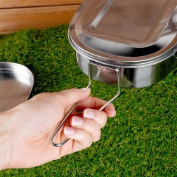 Dieses kompakte Set aus hochwertigem Edelstahl ist eine hervorragende Lösung für den täglichen Lunch ebenso wie für Outdoor-Abenteuer. Der Hauptbehälter mit 900 ml fasst eine sättigende Hauptmahlzeit, der kleinere Einsatz mit 350 ml ist ideal für Beilagen, Snacks oder Desserts. Nach dem Verschließen bildet alles eine stabile Einheit mit zuverlässigen Klammern und einem Klappgriff für einfachen Transport.