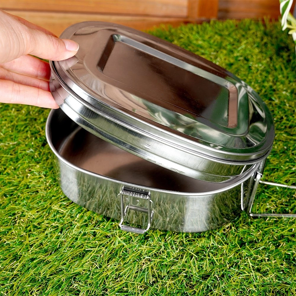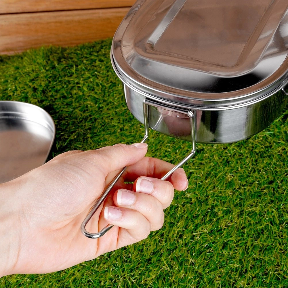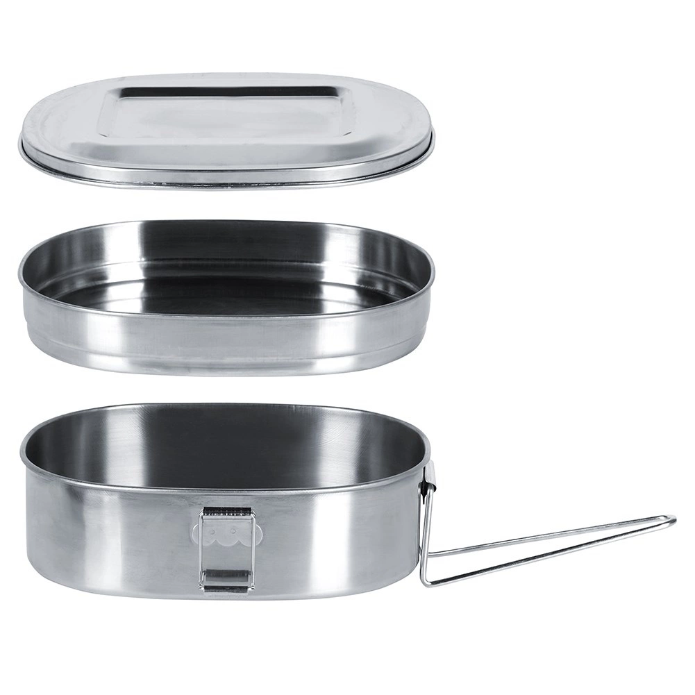 Praktische Outdoor-Menage in Form eines Edelstahl-Lunchbox-Sets mit zwei Schalen (350 ml und 900 ml) und Deckel für den sicheren Transport von Speisen. Robust, leicht zu reinigen und passt mühelos in den Rucksack. Ideal für Ausflüge, Camping und Picknicks. Marke REDCLIFFS.