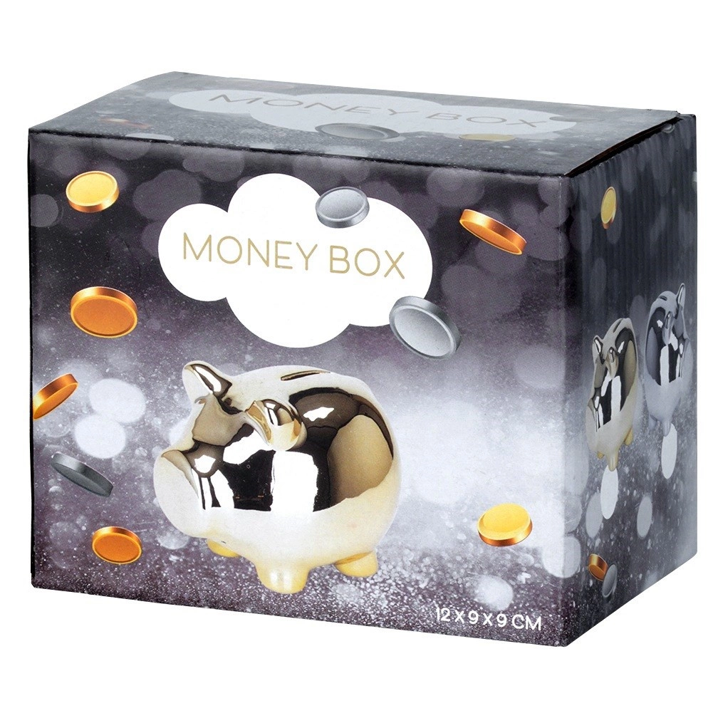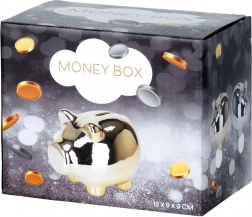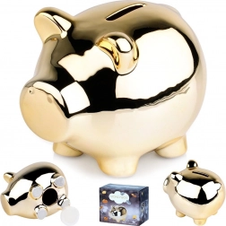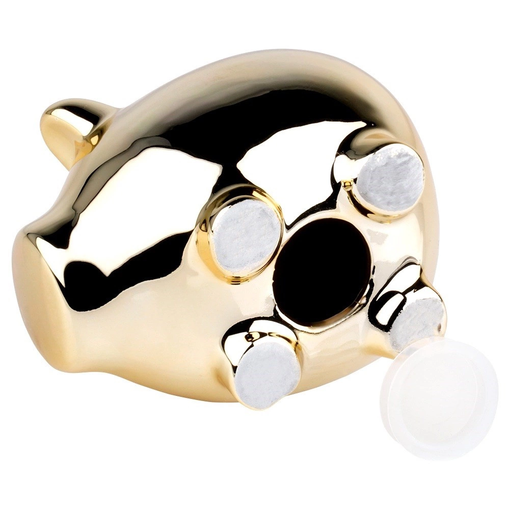 Stilvolle Spardose in Schweinchenform mit spiegelndem goldenen Finish, ideal zum Sparen von Münzen und Banknoten. Kompakte Maße 11,5 × 9 × 9 cm, öffnbarer Verschluss an der Unterseite und dekorativer Glamour-Look machen sie zu einem tollen Wohnaccessoire und einem geschmackvollen Geschenk für Kinder und Erwachsene.