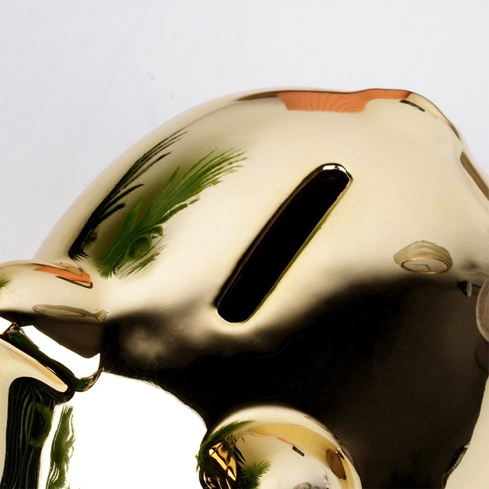 Die reflektierende, glänzende Oberfläche in Gold verleiht der Spardose einen luxuriösen Charakter und macht sie zu einem markanten Deko-Element.