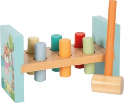 Diese robuste Holz-Klopfbank mit fröhlichen Dschungelmotiven bietet Kindern ab 1 Jahr sicheren und sinnvollen Spielspaß. Gummierte Öffnungen halten die Stifte fest an Ort und Stelle und mildern gleichzeitig die Schläge, wodurch Kinder Griffkraft und Genauigkeit trainieren. Sind alle Stifte eingeschlagen, muss die Bank nur umgedreht werden – und der Spaß beginnt von vorn.