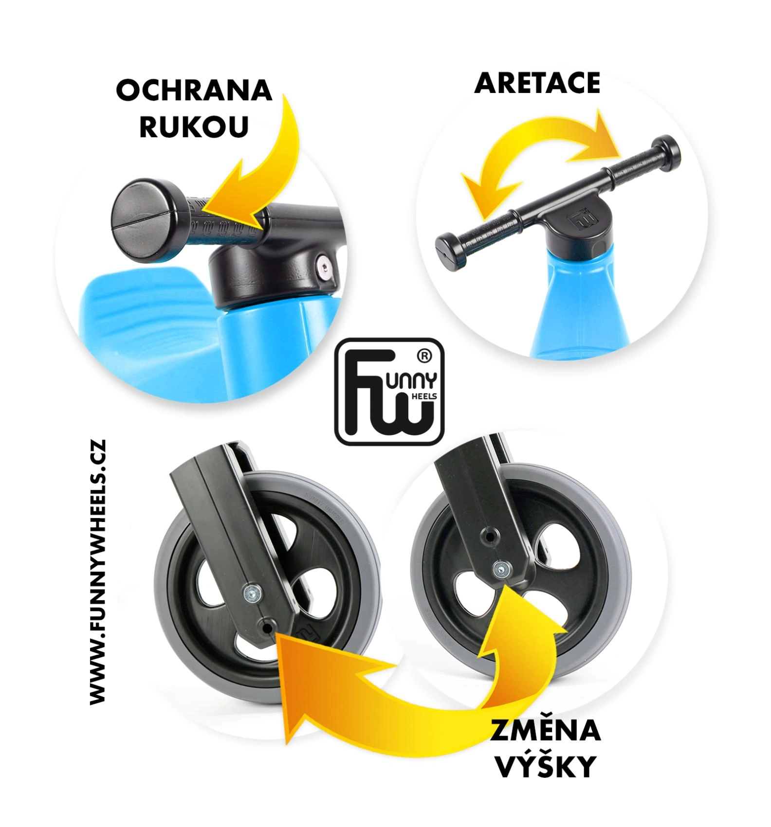 Der begrenzte Lenkeinschlag verhindert ein Überdrehen des Lenkers, verbreiterte Endkappen schützen die Hände und der robuste, unbedenkliche Kunststoff hat glatt ausgeführte Verbindungen.