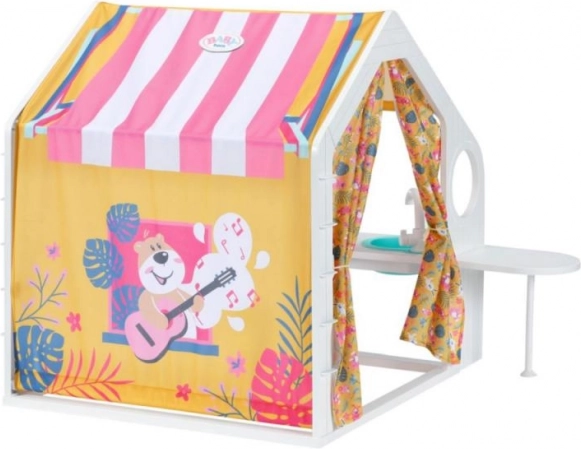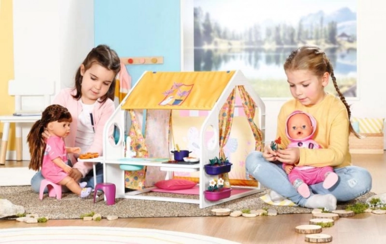 Dank bemalter Wände und detaillierter Dekorationen ermöglicht das Haus Kindern, ein luxuriöses Glamping-Erlebnis mit den BABY born Puppen zu erleben.