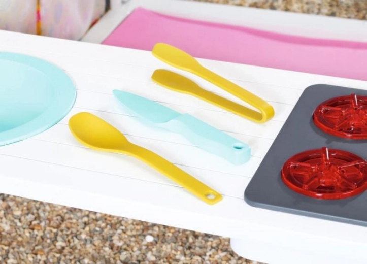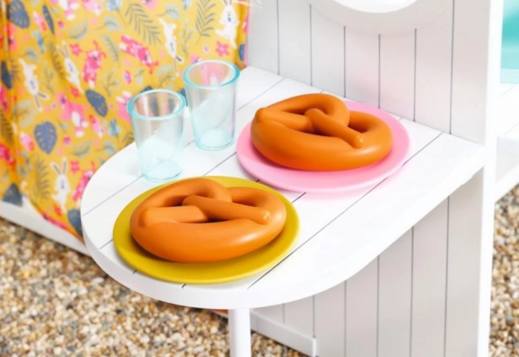 Das Haus ist mit Blumenkästen und einem Gemüsegarten ausgestattet, um Zutaten für imaginäre Abendessen zu ernten. Kinder können auf dem Herd kochen und den Tisch für ihre Puppen decken, indem sie Salate und Brezeln servieren.