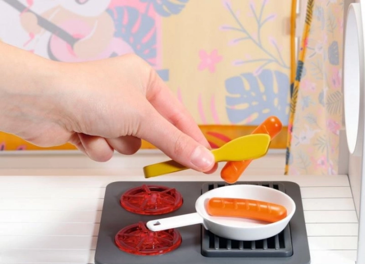 Neben dem unterhaltsamen Servieren von Mahlzeiten können Kinder das Haus auch nutzen, um den Sonnenuntergang zu beobachten und die Puppen im Schlafbereich mit rosa Accessoires schlafen zu legen.