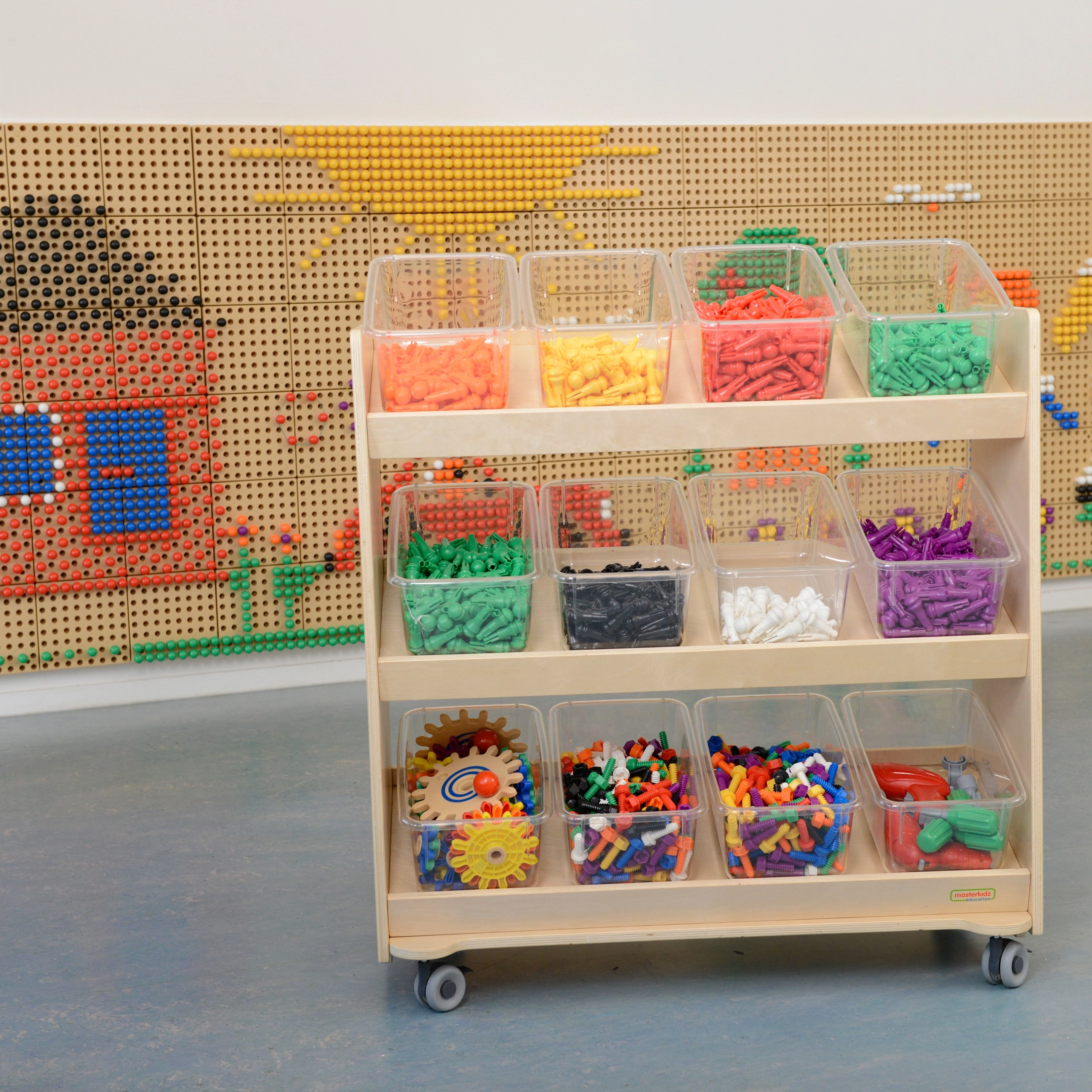 Offene, geneigte Ablagen halten den Inhalt sichtbar und zugänglich – Kinder wählen selbst die richtigen Teile, ohne langes Suchen.