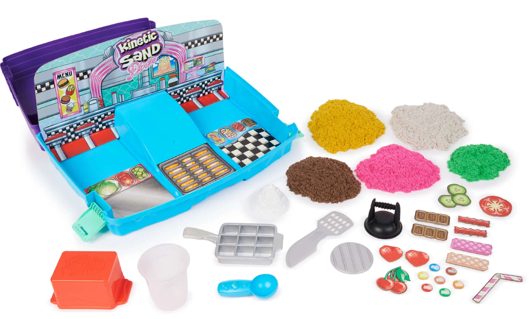 Das Set Kinetic Sand Grill N’ Scoop Diner begeistert kleine Köche und Kreativfans. Öffnen Sie den türkisfarbenen Koffer und er verwandelt sich in eine thematische Diner-Szene mit Grill, Formen und Werkzeugen. Der farbige kinetische Sand lässt sich leicht schöpfen, pressen und zu Burgern, Pommes, Waffeln oder Eisbechern formen – der Fantasie sind keine Grenzen gesetzt.